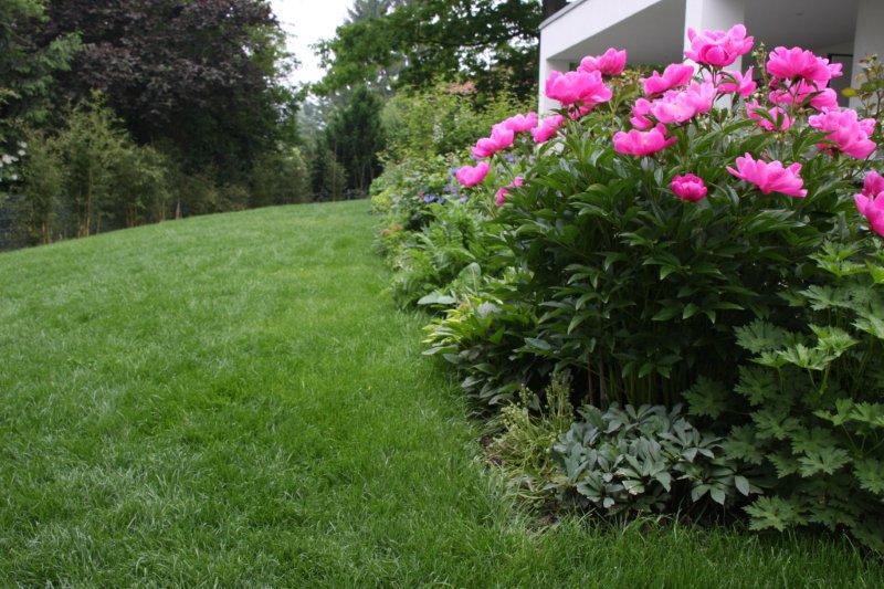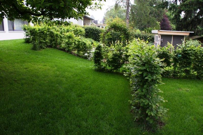 Der Garten ist das Hobby der Familie. Deshalb war die oberste Priorität nicht ein pflegeleichter Garten, sondern ein Garten in dem es nach getaner Arbeit Relaxzonen gibt. Die beauftragte Landschaftsarchitektin hat diese Wünsche im Plan umgesetzt. Die Pflanzflächen und der Teich erfordern einigen Pflegeaufwand. Dafür wirkt die Atmosphäre des asiatisch anmutenden Teiches entspannend, während der Hund der Familie auf den großzügig angelegten Rasenflächen genügend Auslauf hat.