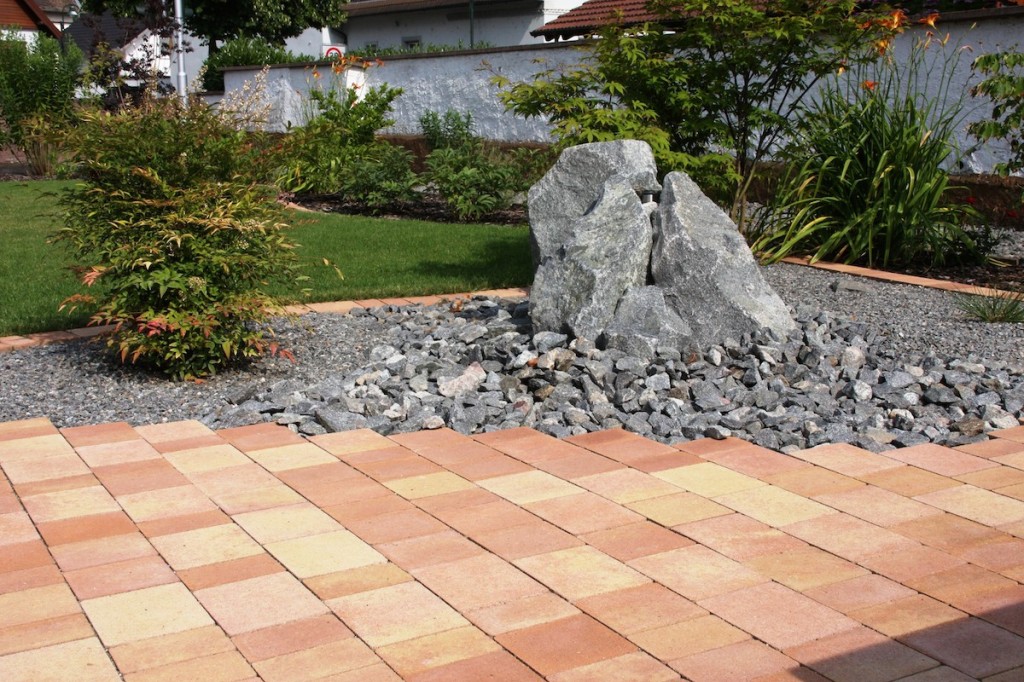 - Gestaltung eines Schotterbeetes mit Granitschotter, filigranerGräserbepflanzung und einem Quellstein, der abends beleuchtet wird
