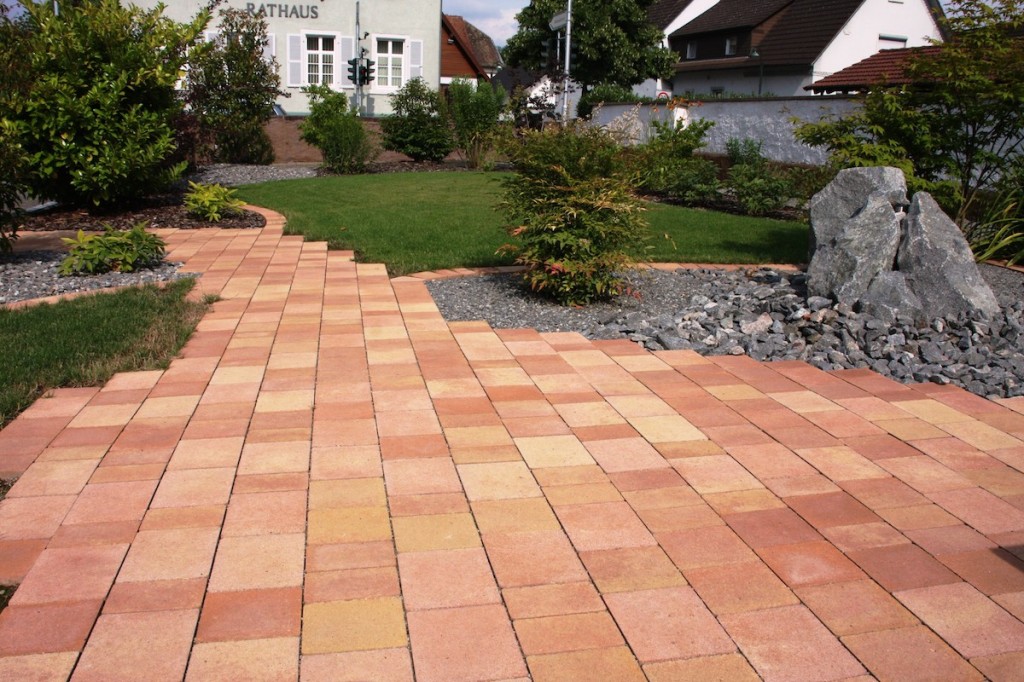 - Erstellen einer Belagsfläche als Außenterrasse aus terracottafarbenen Pflastersteinen