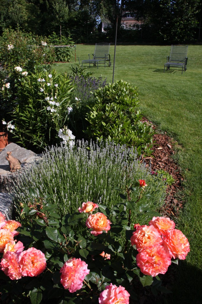 Optik: Auftrag war, im vorderen Teil, in Richtung Straße, sollte pflegeleicht und harmonisch gestaltet werden, dabei war gefordert, dass der Freisitz vor dem Haus nicht einsehbar sein sollte. Dagegen wollten wir im rückwärtigen Teil des Hauses einen gemütlichen Freisitz mit schönen Pflanzen, einem Rasenteil und einem Beerenbereich mit einem Küchenkräutergartenteil haben. Diese Aufgabe wurde zu unserer vollsten Zufriedenheit erfüllt. Nicht nur wir Bewohner, auch unsere Freunder, auch fremde Gäste finden die Lösung als hervorragend vollzogen. Auch uns nicht bekannte Spaziergänger bleiben stehen und betrachten die Außenanlagen. Wir fühlen uns sehr wohl und genießen dieses Flair.