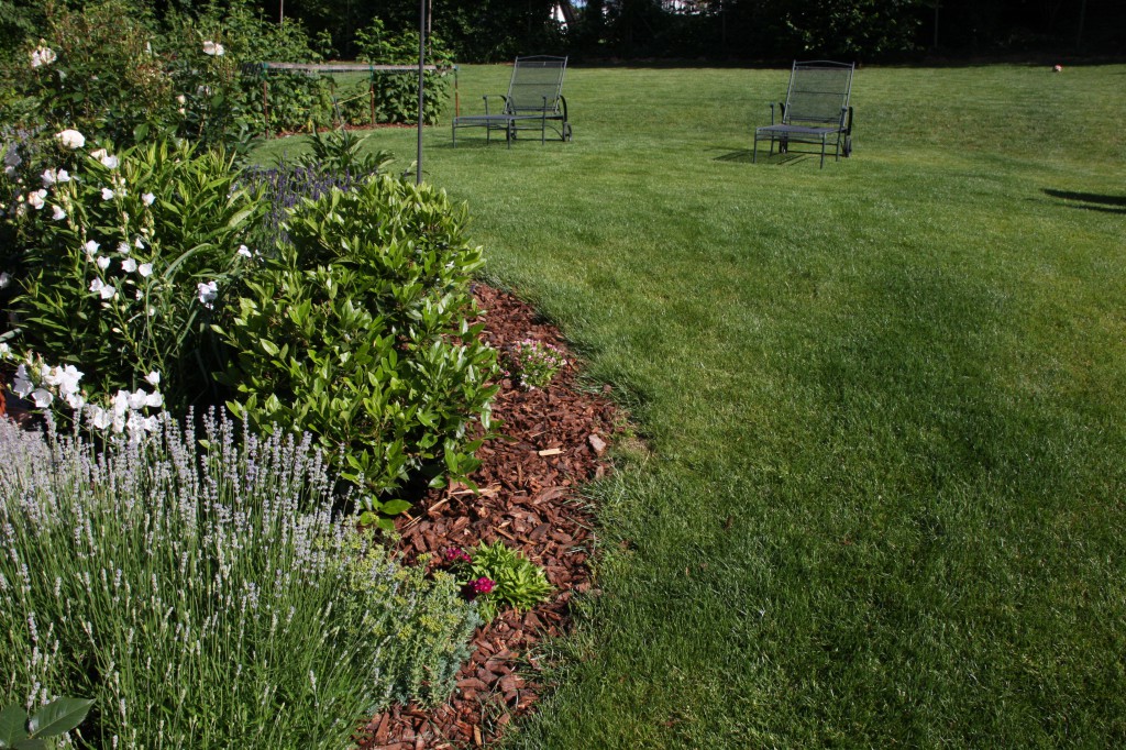 - Die Pflanzflächen wurden mit Rindenmulch abgedeckt. Dies vermindert den Unkrautwuchs und macht den Garten pflegeleicht.