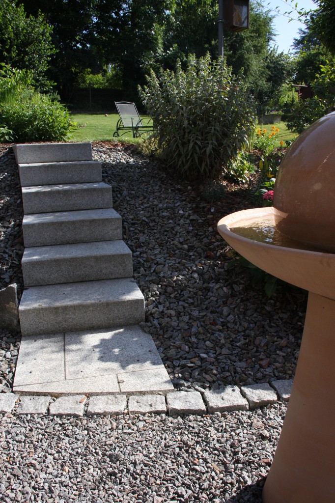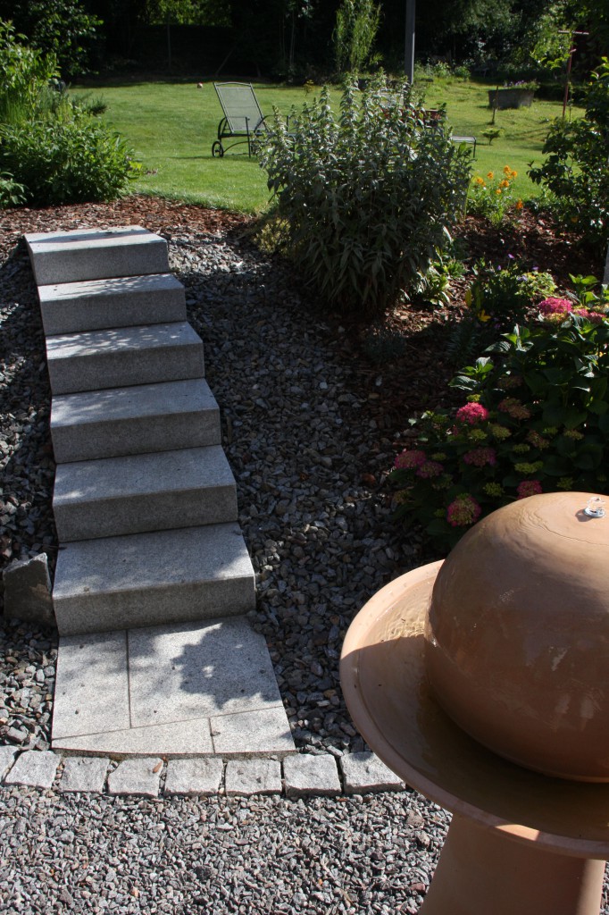 - Eine Gartentreppe aus Granitsteinen verbindet die tiefer liegende Terrasse mit der neu gestalteten Gartenfläche