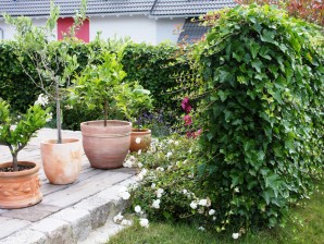 Die Gartengestaltung entspricht den Bedürfnissen mehrerer Generationen. Von der Terrasse aus ist der Garten gut einsehbar, die Enkelkinder sind nie unbeobachtet. Ein kleines Wasserspiel ergänzt die Pflanzgestaltung, wirkt beruhigend auf die Erwachsenen und macht den Enkelkindern Spaß beim Spielen. Ein Brotbackofen ergänzt die Gartenmöblierung, sodass der Hobbykoch/-bäcker die Terrasse auch als Außenküche nutzt. Im Sommer dient der Garten der ganzen Familie als Garten-Wohnzimmer und Familientreffpunkt.